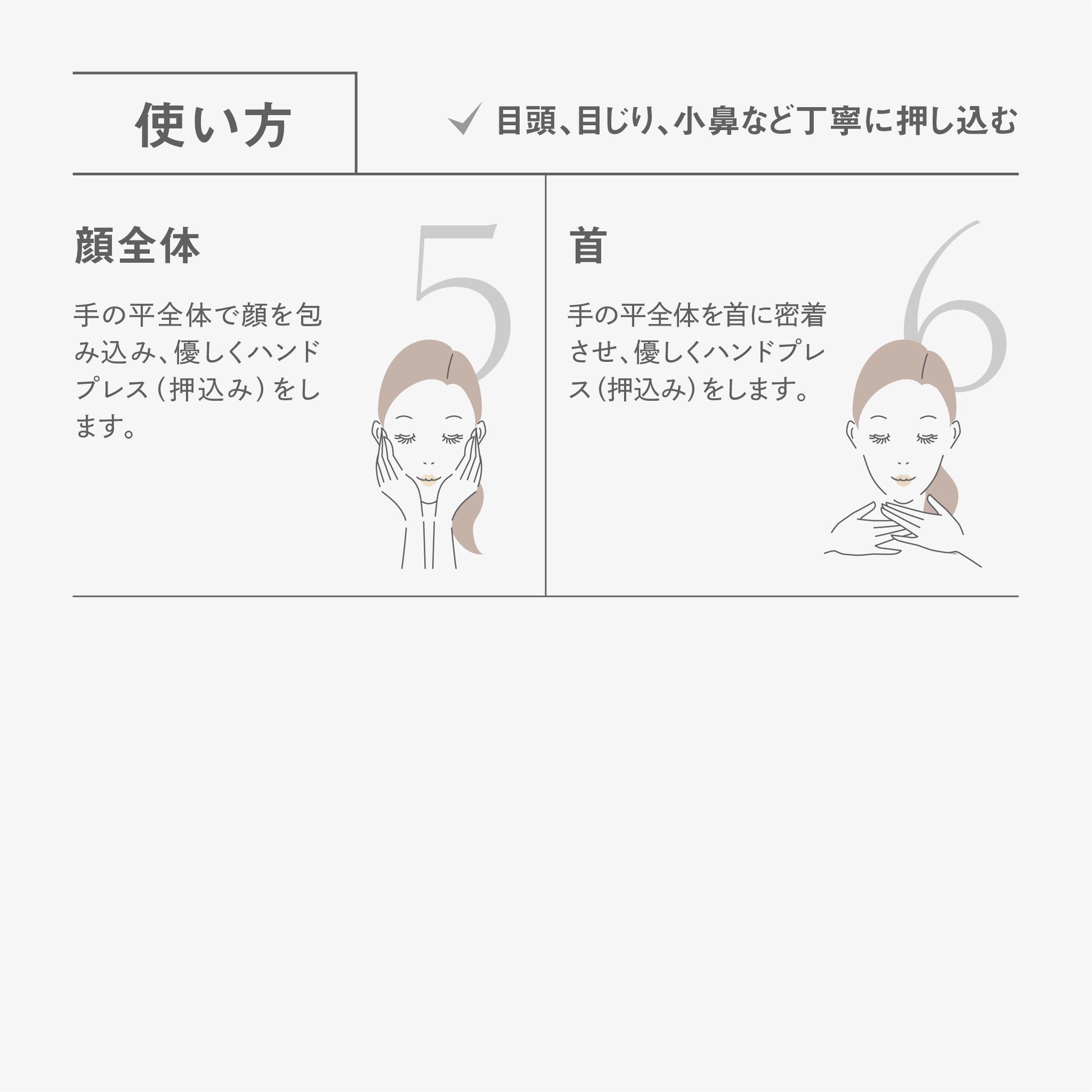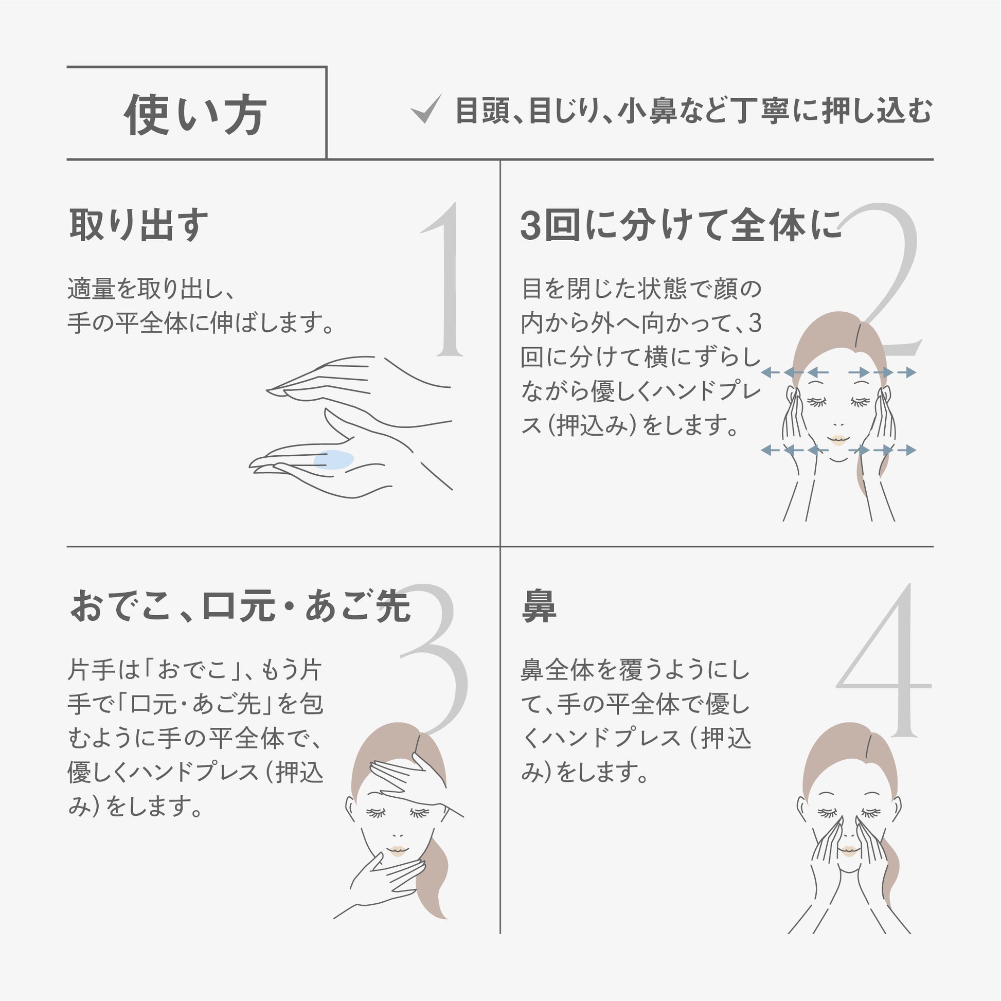 目を閉じ、手のひらで顔全体を包み込むようにして、顔の内側から外側へ向かってズラしながら、やさしくハンドプレスで押し込むように馴染ませます。