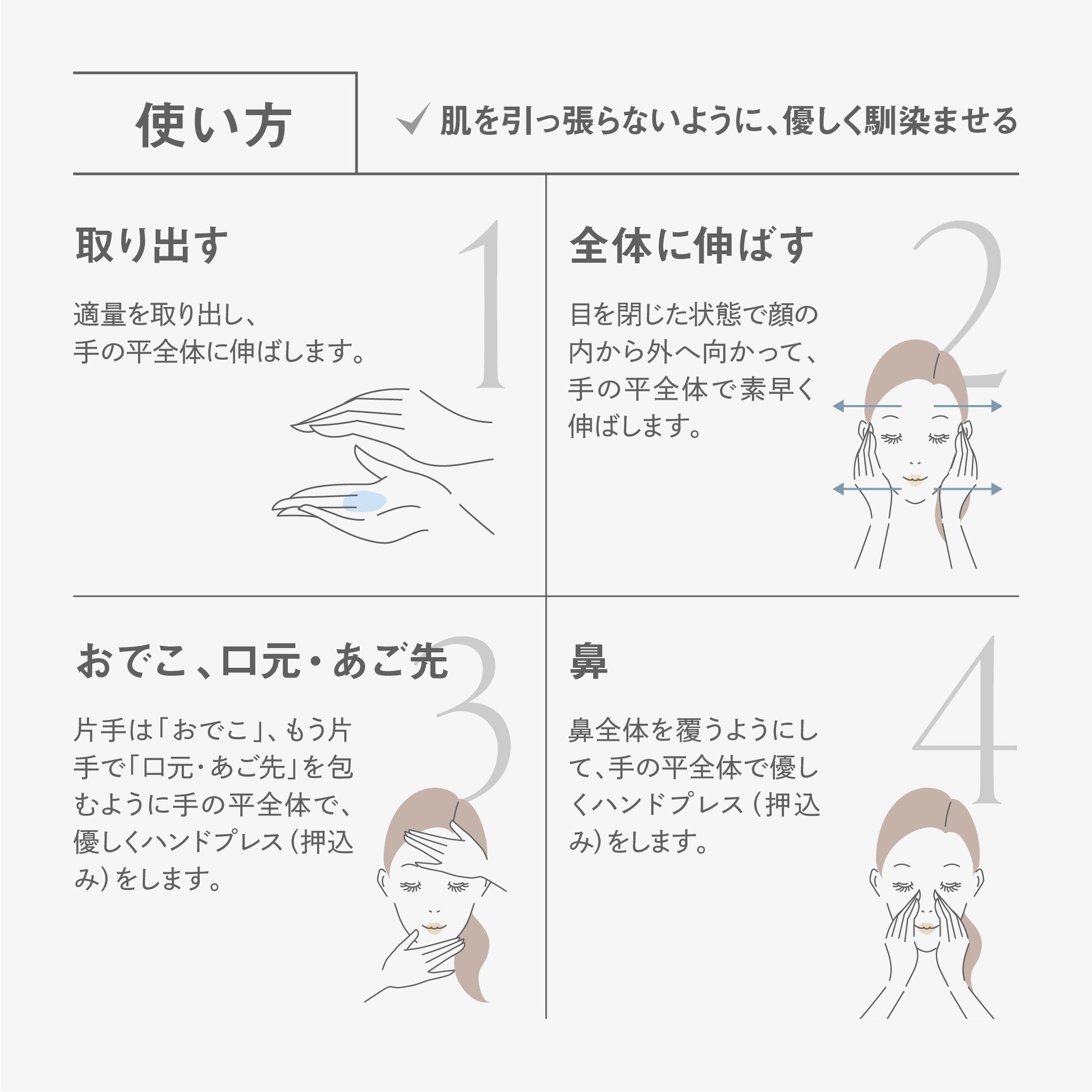 顔の内側から外側へ向かってズラしながら、顔全体にやさしくハンドプレスで押し込むように馴染ませます。