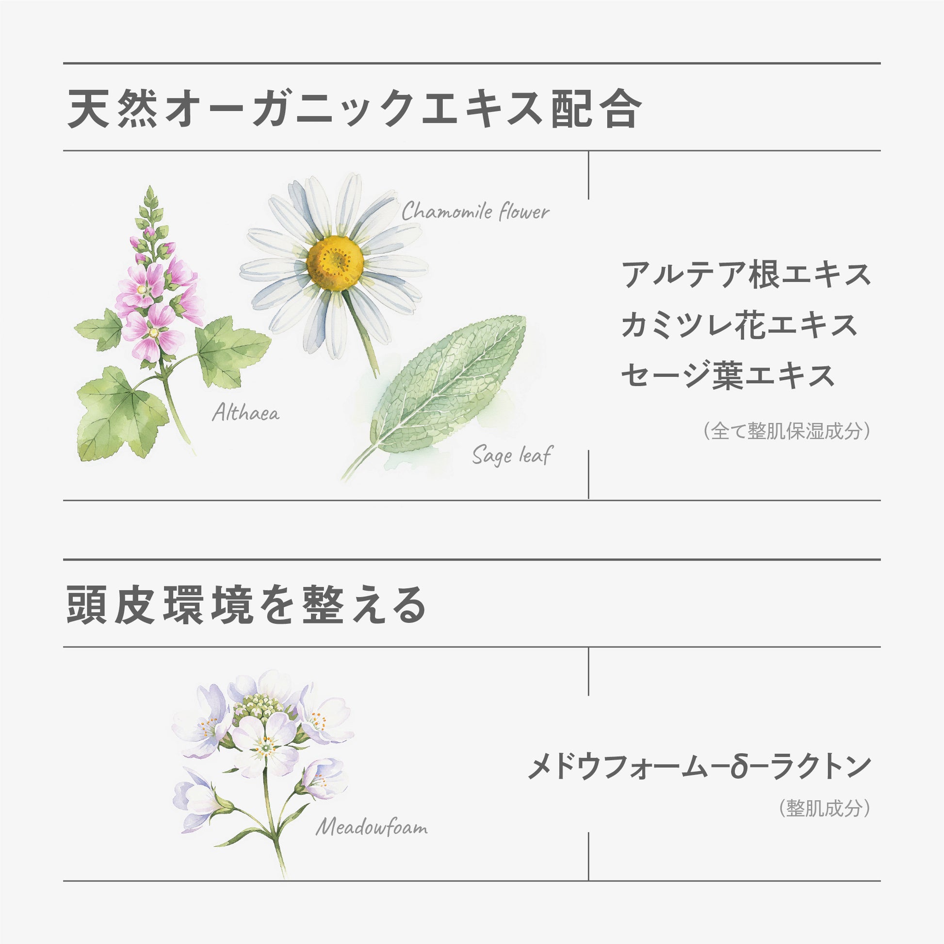 - 独自湿成分の「スカルプケア抗体*1」「抗薄毛環境抗体*1」を配合し、頭皮環境をすこやかに保ちます。