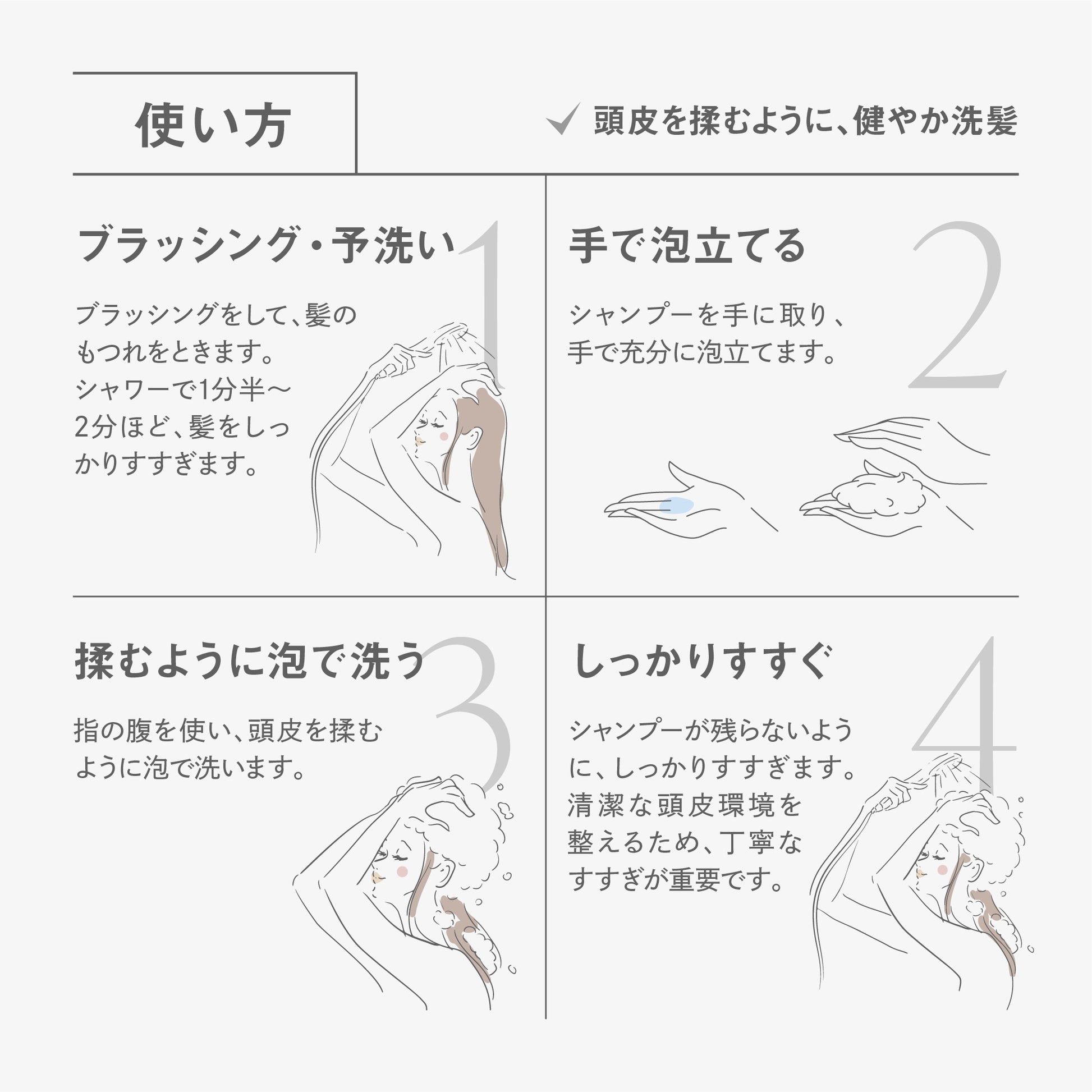 - 水溶性コラーゲンなどの保湿成分が頭皮の乾燥を防ぎ、フケ・かゆみに配慮します。